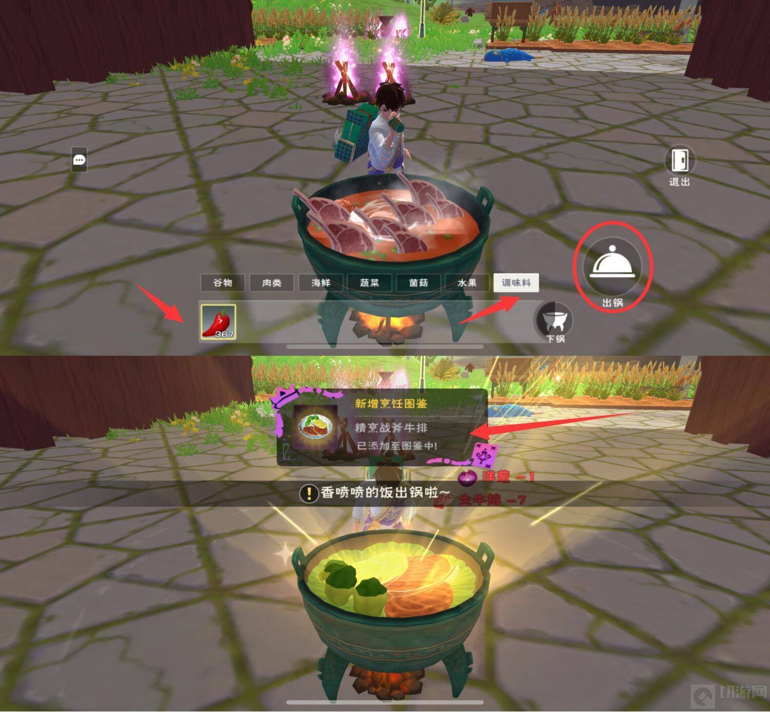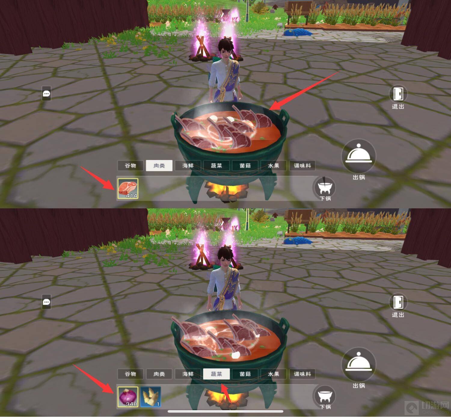 2、制作出炊鼎之后,将生牛排、辣椒、洋葱都带在背包,然后点击点火,选择肉类放入7块生牛排,接着点击蔬菜类放入1个洋葱。
