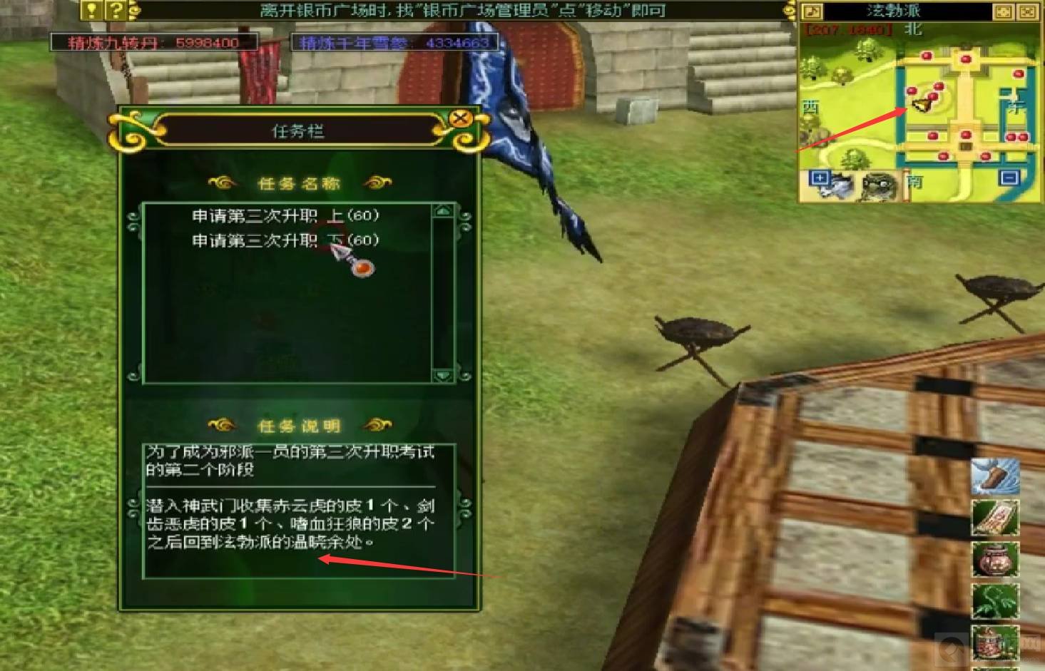 9.温晓余位置如下图,再去正派地图神武门获得赤云虎、剑齿恶虎和嗜血狂狼的皮,返回提交给温晓余。