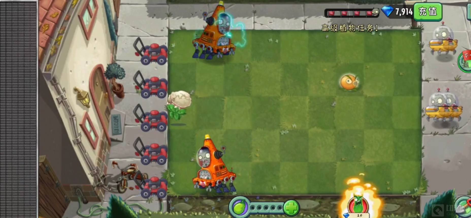 5.来了俩个柚子,种在2.4路,5路的机甲路障让菜花魅惑回去,还能打机械小鬼僵尸。