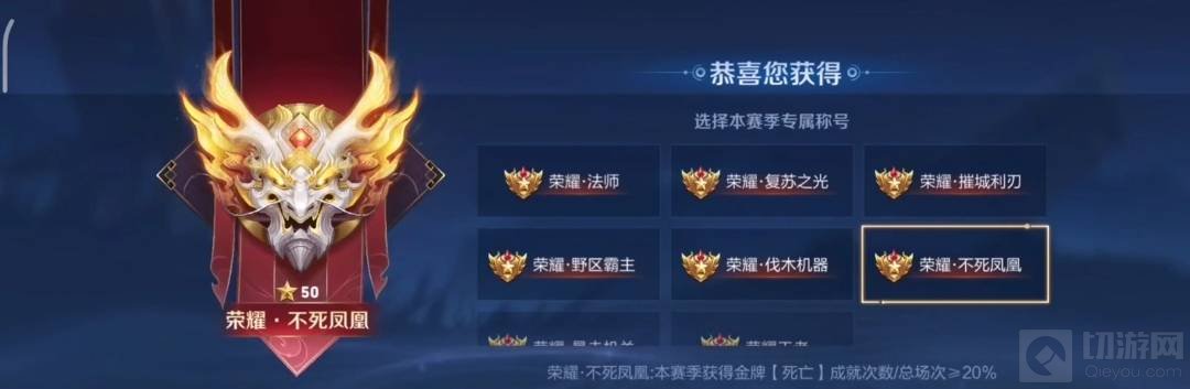 当本赛季达到荣耀段位后,系统将会根据战斗风格获得专属称号,其中不死凤凰称号获得条件为本赛季获得金牌【死亡】成就次数/总场次≥20%。