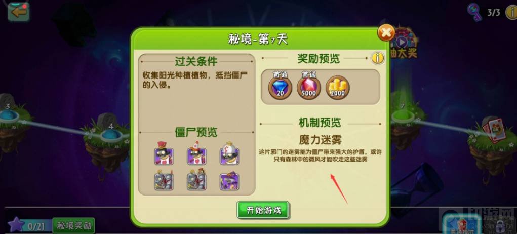 1、迷雾一般出现在童话森林的秘境关卡,进去的时候会写清楚魔力迷雾的解法,这些迷雾会给僵尸带来强大的护盾,只有森林的微风才能吹走这些迷雾。