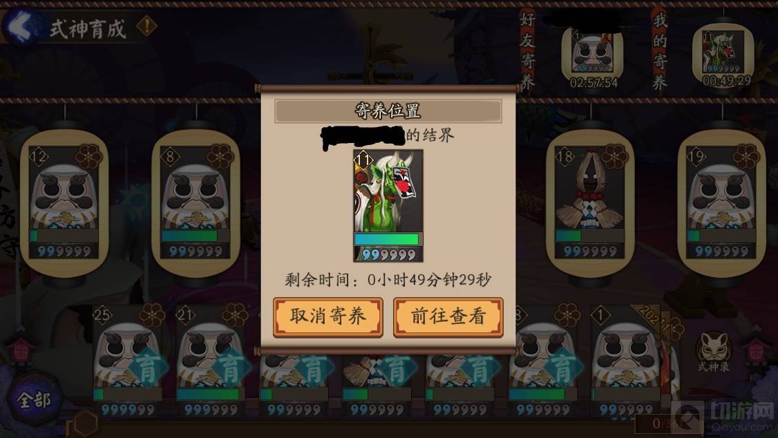 二、然后点击结界中央的“式神育成”,可以看到右上角的好友寄养和我的寄养。