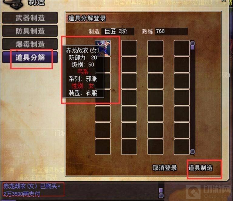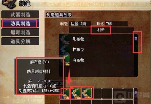 1.麻布卷需要裁缝账号才可以制作,可以到近到银币市场里面的npc玉娇龙那里学习裁缝术。然后拿一件40~50级白2转衣服、护手、鞋子等防具分解成麻布。打开制作窗口,选择道具分解,然后把防具放进窗口,在勾选道具制作,就会获得麻若干个,数量系统随机。