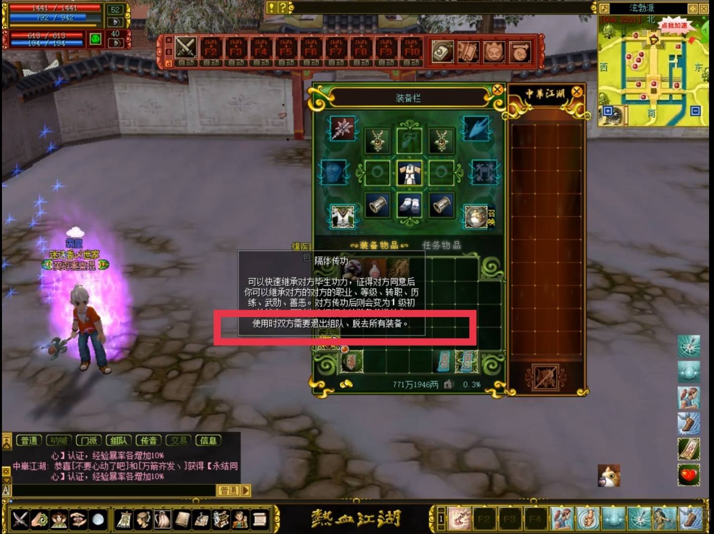 1.首先传功双方都要退出组队,并脱掉身上所有的装备。