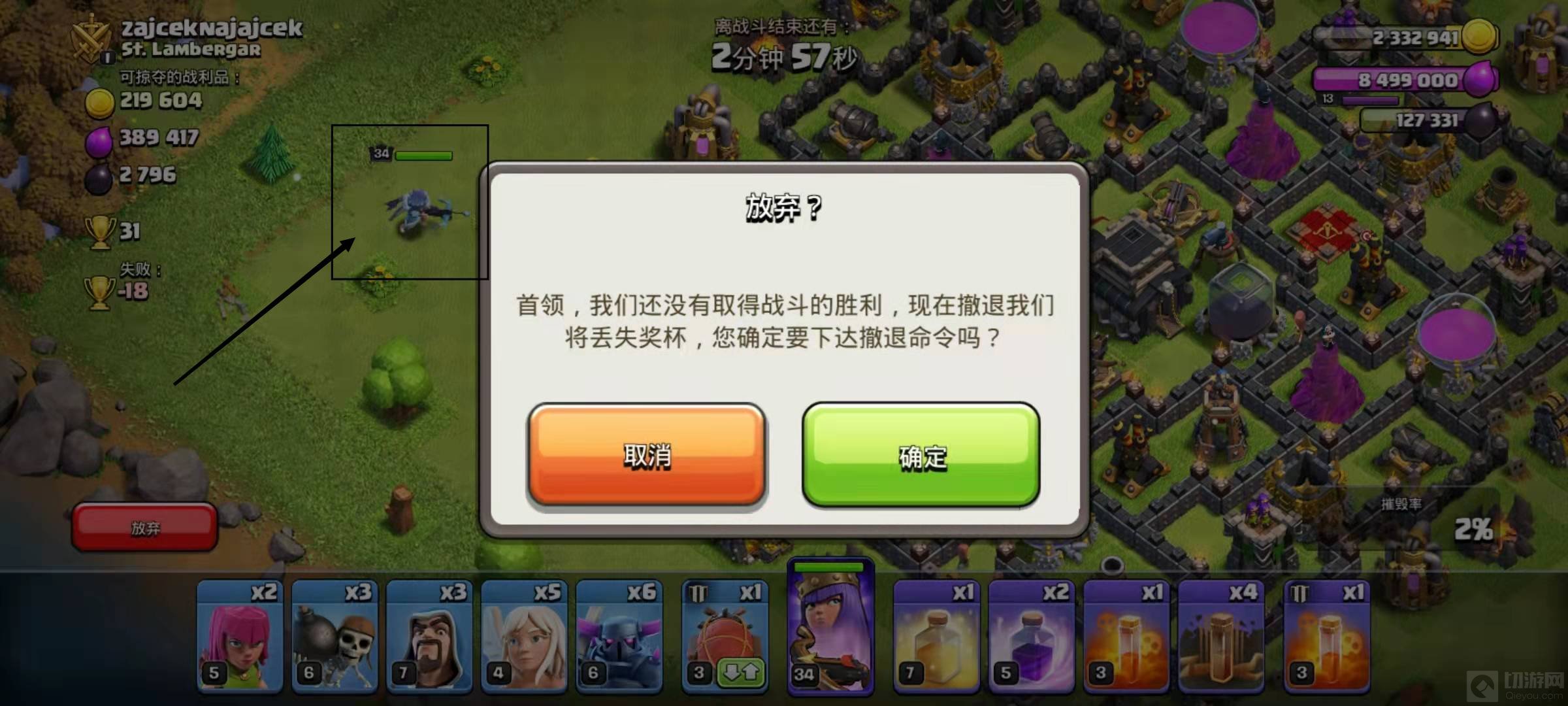 2. 找到对手后,在任意地方放一个英雄,然后迅速点击放弃,点击确定,然后就会损失很多奖杯,很快的就能从传奇杯掉下来。这里建议放英雄的原因是英雄派出后放弃不损失兵力,但最好不要让英雄收到攻击,放弃后英雄不用回复血量,再浪费时间。