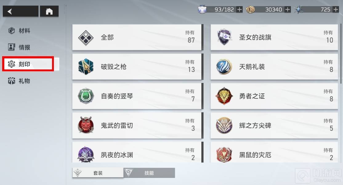 2、然后在仓库页面找到刻印,点击选择刻印。
