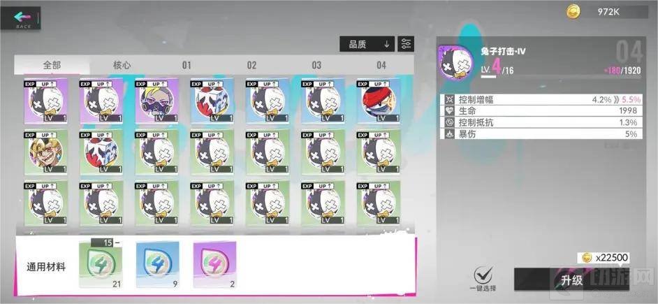 2,涂鸦部件一共有四个,游戏里称之为01/02/03/04号位。涂鸦部件不同于核心,涂鸦核心不仅有五种稀有度,并且涂鸦部件是可以升级的,上限为16级。每个涂鸦部位上一共有五个词条,最上面的是主词条,下面四条都是副词条。副词条还没有达到4条的时候,部件每升3级就能解锁一条新的副词条。稀有度越高的部件,词条的属性具有越高的上限和下限,所以白绿蓝的部件没必要升级,带上能触发套装效果就行,终究还是要往紫色和金色上刷的。
