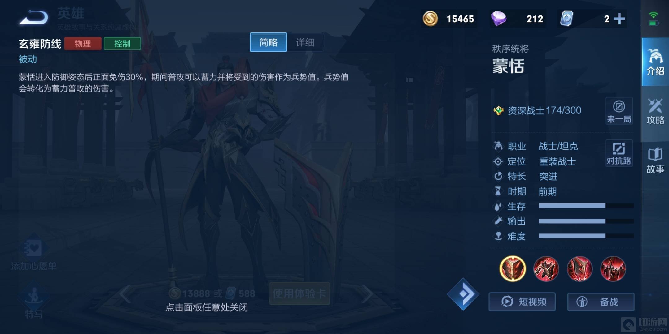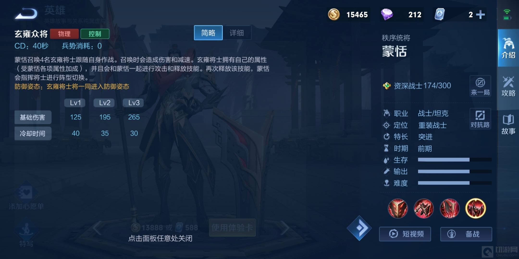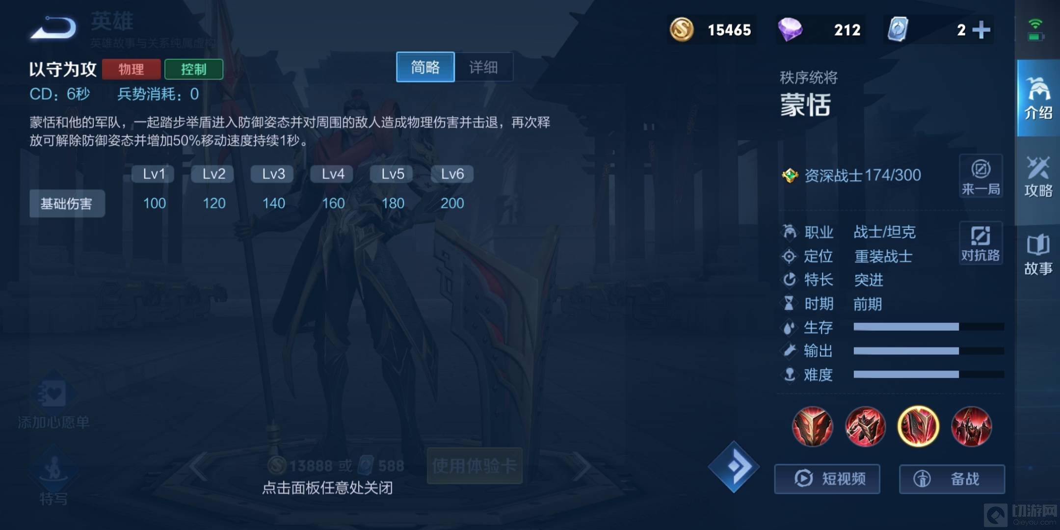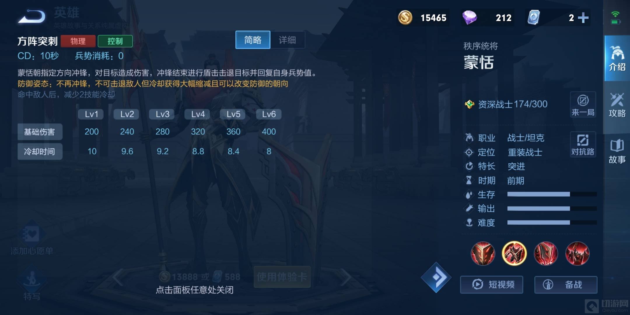 蒙恬是一位战士/坦克英雄,主要定位是重装战士且擅于突进。
