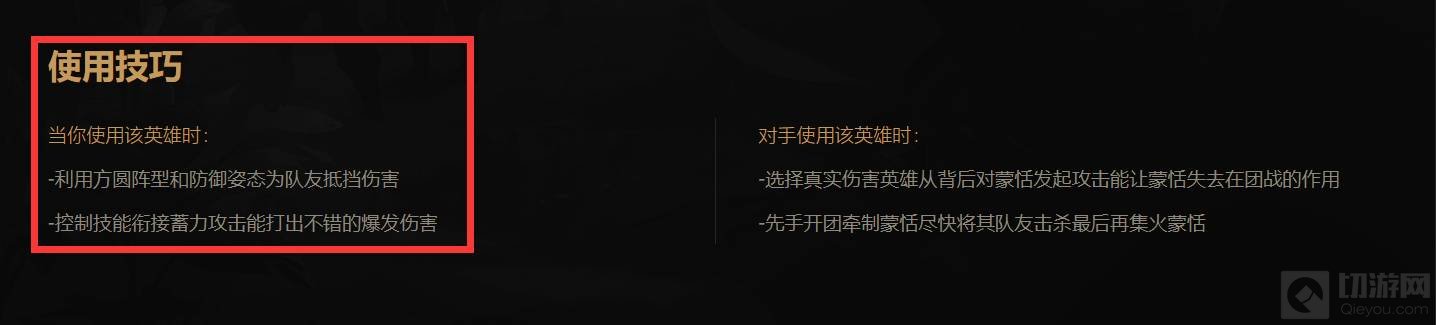 团战前开启大招后一技能突进到敌方阵型内,再切换二技能防御姿态快速打出击退控制,防御姿态下蓄力普攻即可。