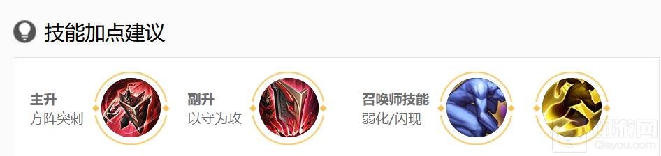 5.召唤师技能推荐技能加点:有大招升级大招,主要升级一技能方阵突刺,次要升级二技能以守为攻。