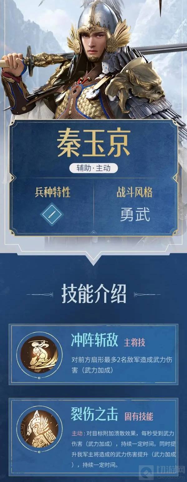 1、首先了解秦玉京,这是一位剑士角色。有两个技能分别是冲阵斩敌和裂地之伤,从技能来看这是一位强力的输出型的角色。