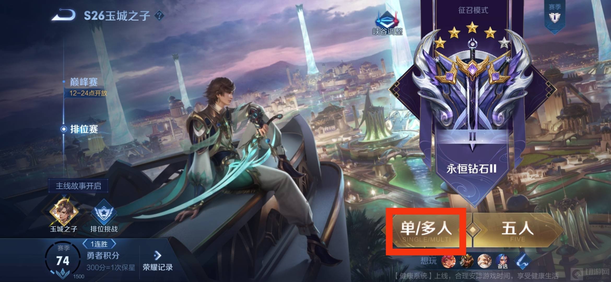 王者荣耀怎么发王者状态?在游戏中有部分玩家对此还不太了解。接下来让为大家介绍一下吧。 王者荣耀发王者状态方法 1.首先打开王者荣耀,进入主页面后点击排位。 2.然后点击单/多人。 3.接着点击右上