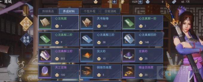 3、在有了侠客的基础之后,侠客的养成也是游戏的一个关键,这里就建议在元宝商城里面购买养成材料了。材料方面心法和突破的材料建议大家优先购买,这些材料带来的提升是非常大的,而且在价格方面也不适很贵的,性价比很高。