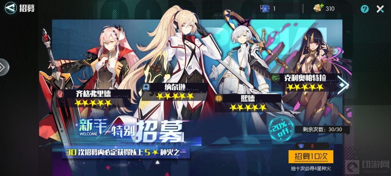 2、目前这个版本的话,加上新手池的话,就是三个池,新手招募的话,就是只能抽30发,但是每十发只需要花八个电子名录。抽完这30次,这个池子就会消失,相当于新手福利吧,全弄就行的啦,不亏的。