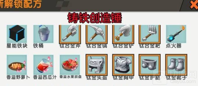 3. 将手里的工具切换成黄铜创造锤并使用即可解锁铸铁创造锤,以及相关的矿产,生产工具和武器装备的配方。注意:解锁黄铜创造锤后也可解锁新版本的防火背包和氧气面罩的配方。