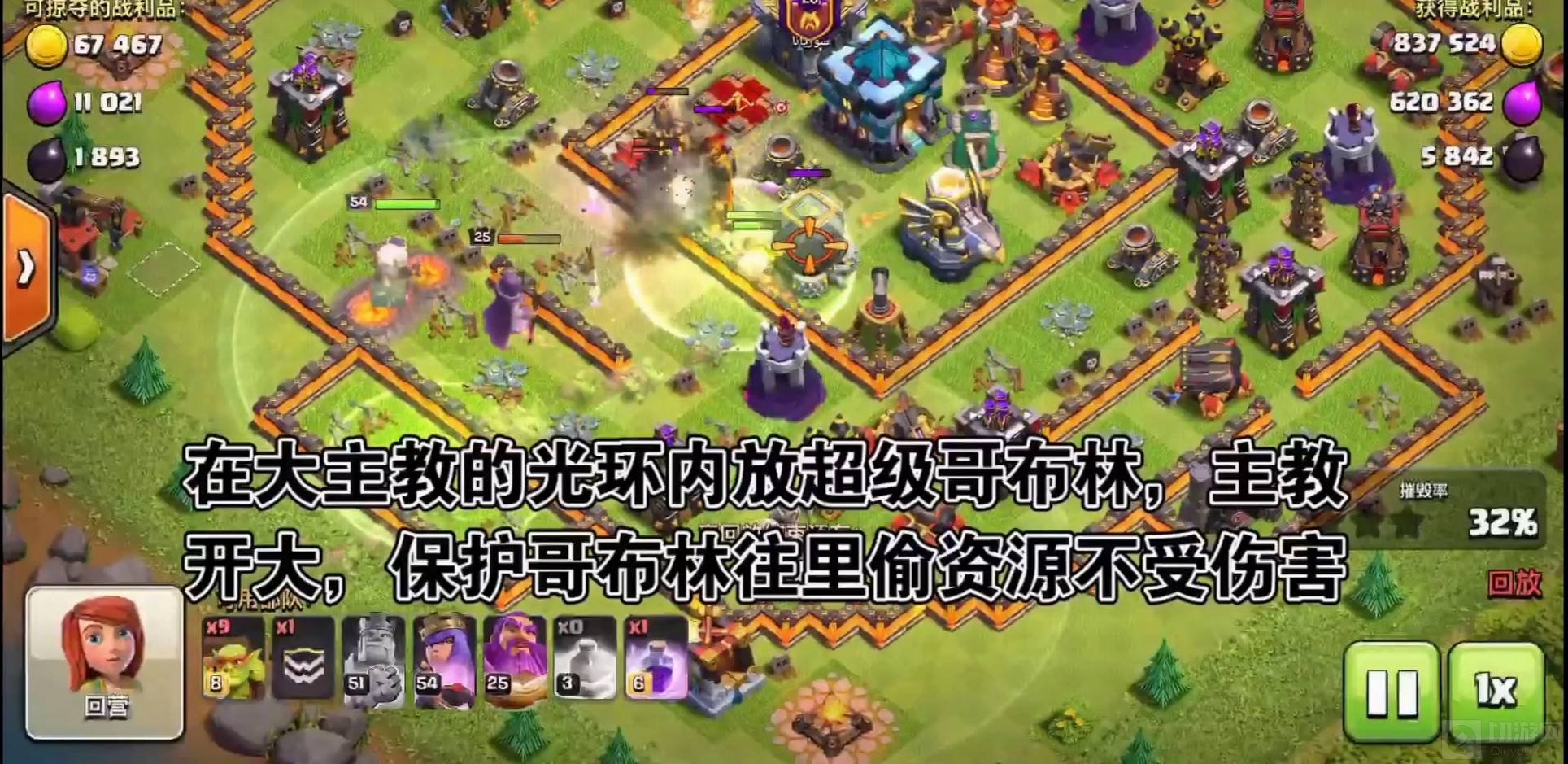 4. 最后放大主教和超级哥布林,把超级哥布林放在大主教的光环中,这样可以保证超级哥布林不受伤害,顺利偷取对方资源,这就是超级哥布林偷资源打法。