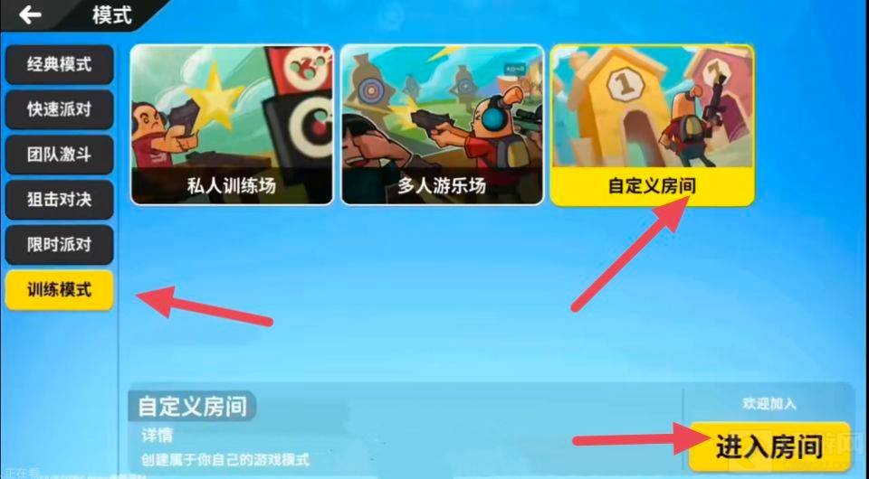 香肠派对怎么进房间?在游戏中有部分玩家对此还不太了解。为此整理了一些攻略,大家快来看看吧。 香肠派对进房间攻略 1.进入游戏后,在训练模式点击自定义房间。 2,点击进入房间后,选择空闲的房间或输入