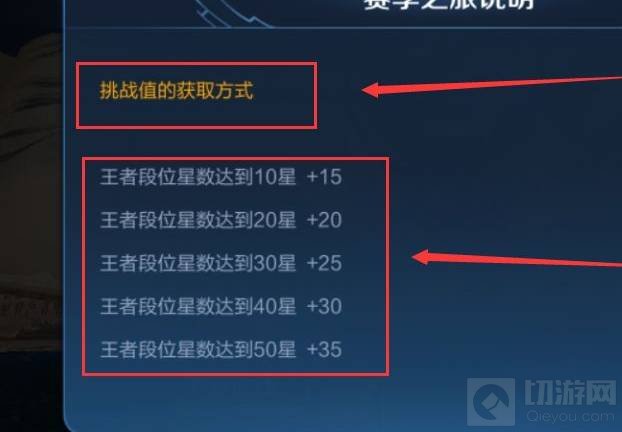 6、接着滑动页面到下面,就可以看到王者荣耀挑战值获得方式分别是排位赛达到一定的星数和巅峰赛积分达到一定的数值。