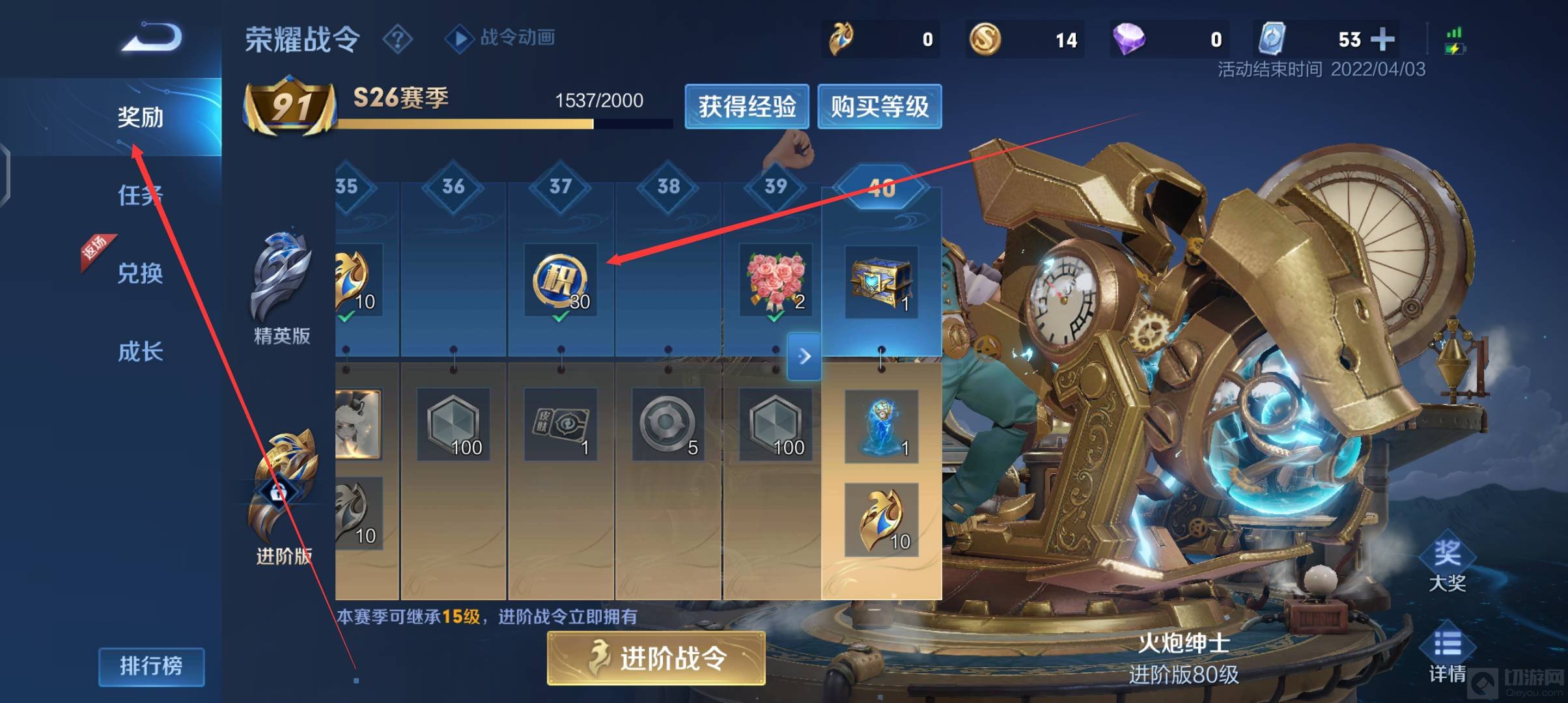 2、然后在战令获得一定的等级时,可以领取荣耀积分。