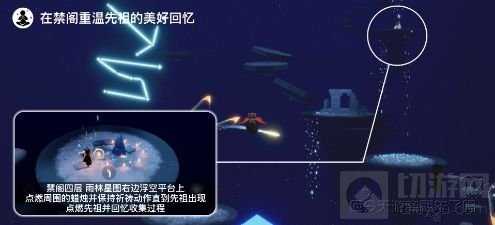 完成方法:禁阁四层,雨林星图右边浮空平台上。需点燃蜡烛摆出祈祷动作直到中间石碑完全变白,然后重温出现的先祖的收集过程