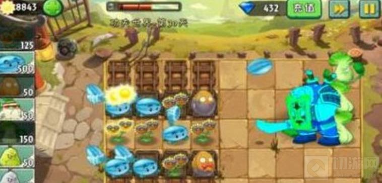 2、当BOSS血量减到第二格血量条,BOSS技能就厉害了,可以砍整条植物,所以要速战速决,降低BOSS速度。累积到9000 阳光和5能量豆时。迅速铲掉矿车左二排的向日葵,换上冰西瓜。