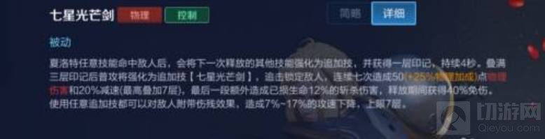 1、夏洛特的被动技能是七星光芒剑,效果是任意技能命中敌人后,会将下一次释放的其他技能强化为追加技,并获得一层印记,持续4秒。