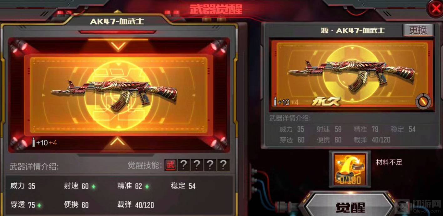 2、然后点击觉醒,使用100个觉醒材料就可以将武器觉醒成ak47血武士。