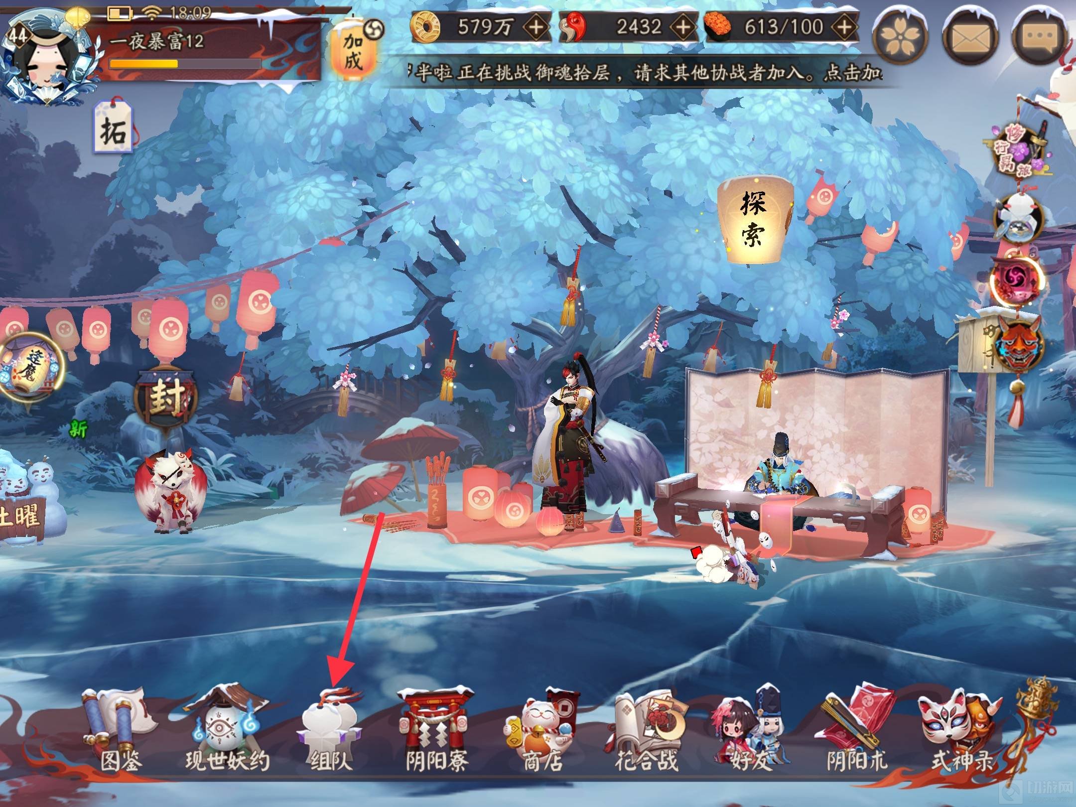 2、在庭院下方选择组队并选择经验妖怪自己创建队伍,尽量选择等级高的队友组队。