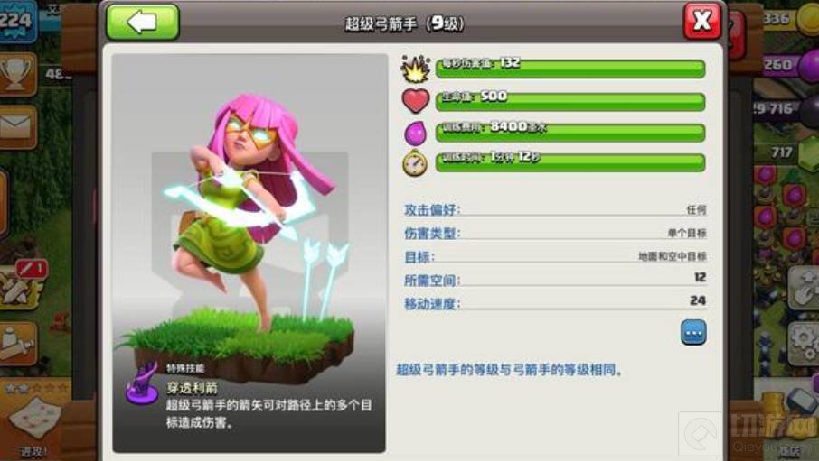 2. 但是升级后的超级弓箭手每秒伤害132,是普通弓箭手的4倍多,生命值也是有500之多,比起普通弓箭手得到了成倍的提高。生命值和伤害得到了提高意味着就可以在对战当中作为主力部队使用,但是相对的占用空间也是普通弓箭手的12倍,500的血量相当于2个普通的野蛮人,完全可以在建筑的伤害之下得到存活。作为主力部队使用配合肉盾,再加上超级弓箭手的特性,可以对阵型进行成吨的输出。也是大家可以发掘的兵种之一。