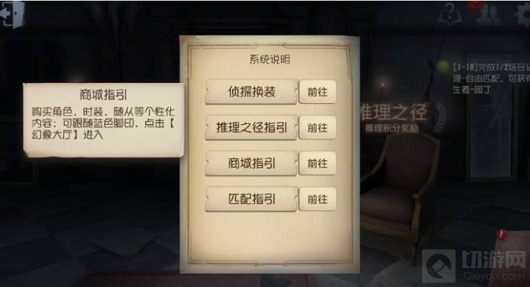 第二步,跟随打开“系统说明”界面,点击“商城指引”右侧的前往按钮,跟随蓝色脚印,前往“幻象大厅”进入;
