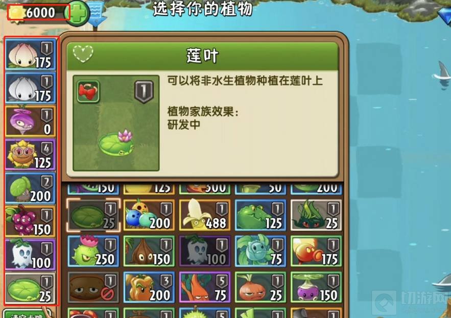 1.首先鲨鱼僵尸博士开打之前,系统会给玩家6000太阳,并且可以先排列阵容,如图所示选用这几个植物即可。