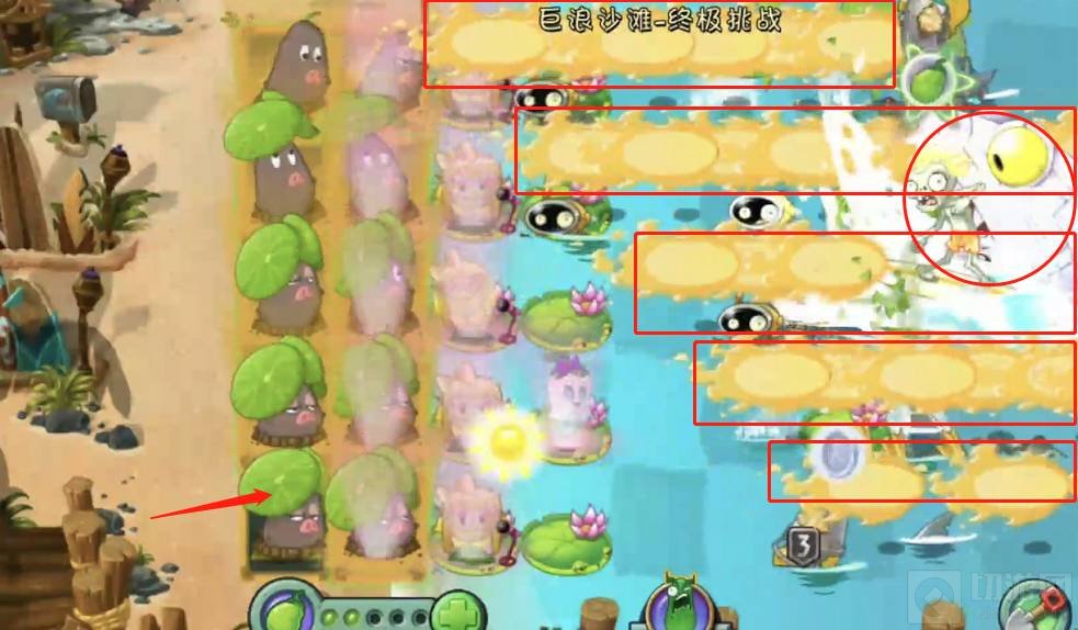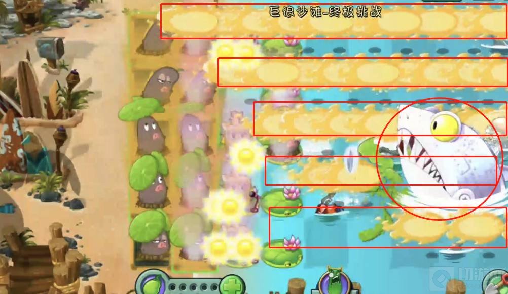 4.其次就是鲨鱼僵尸此时会释放的技能,如图所示或随机在两排植物道路上进行吸取,被吸取的道路将没有植物,还要重新摆放,以及随机在河面上抽取几个位置释放鲨鱼,被选中的植物位置都会被鲨鱼吃掉,还要重新摆放,并且这些技能是无法躲避的。