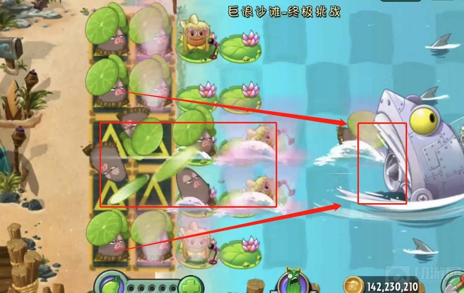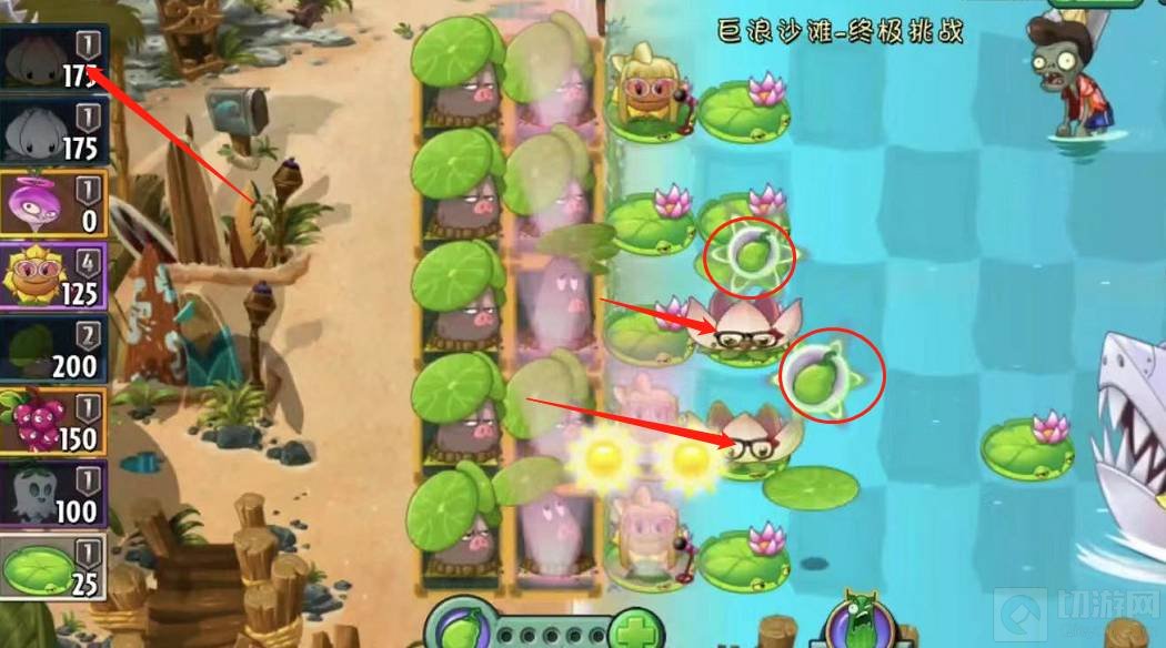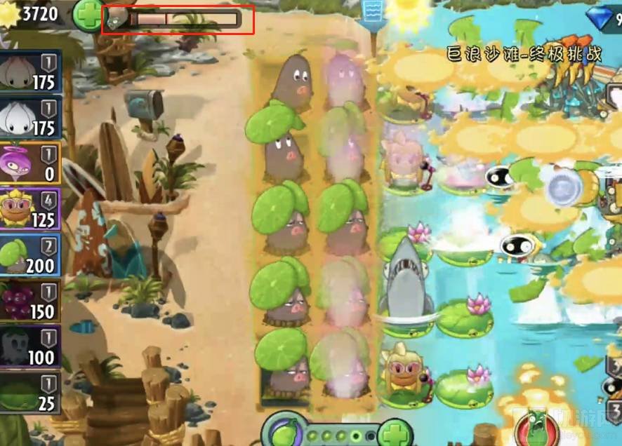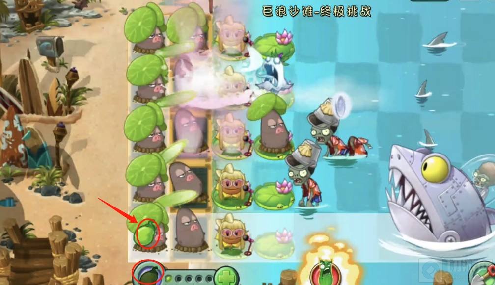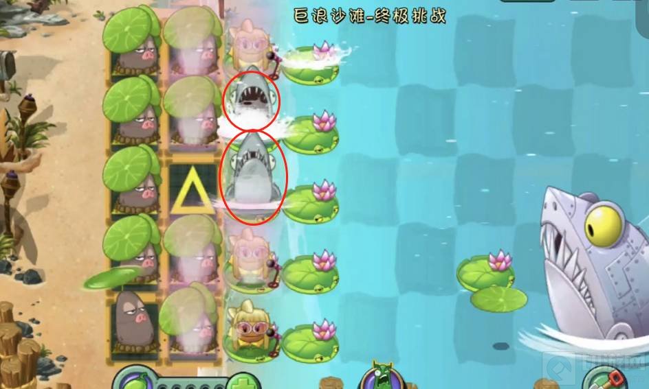 7. 最后操作就不用太多了,不断使用豆子配合植物本身的普通攻击伤害,直到打到鲨鱼僵尸血量耗尽即可。