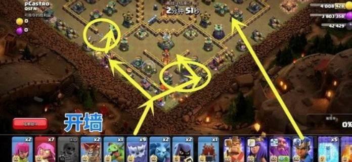 很多小伙伴认为“一字划”很一个非常简单的操作,这就和“雷龙”这个流派有着异曲同工,但是“一字划”也不是乱划的,也要规划“思路”和“打法”那么“最后一搏资格赛挑战”应该怎么规划呢?首先在9点钟投石炮的区域用“超级炸弹人”开墙,然后在6点钟方向“天鹰火炮”的区域用“超级炸弹人”开墙,因为这两个区域要用大部队进攻,炸开城墙能起到引导作用,而3点钟方向的“投石炮”我们就用闰土加上“骷髅法术”来解决,这就是我们的进攻思路。