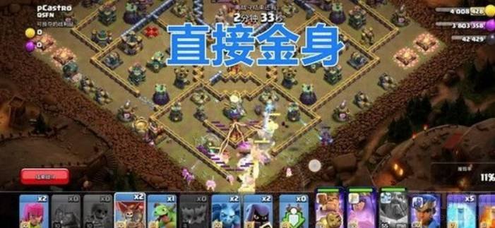 当打下3点钟方向的区域以后,我们在把视角拉到9点钟方向,具体的操作和3点钟区域是一样的,2瓶“骷髅法术”加上1个英雄猎手,如果我方大部队被消灭了,那么就在这个地方补1瓶冰冻法术,把剩下的兵种放在这个区域,例如弓箭手和气球兵来帮助清理这个区域。