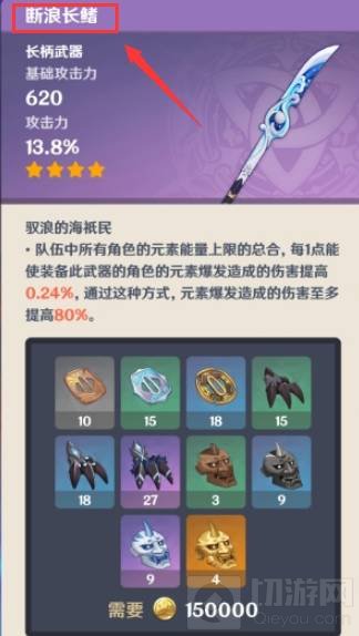 原神断浪长鳍怎么获得?在游戏中有部分玩家的此还不太了解。接下来让为大家介绍一下吧。 原神断浪长鳍获得技巧 1、断浪长鳍,需要3个今昔剧画之虎啮、12个隐兽指爪、8个破旧的刀镡以及15000个摩拉,今昔