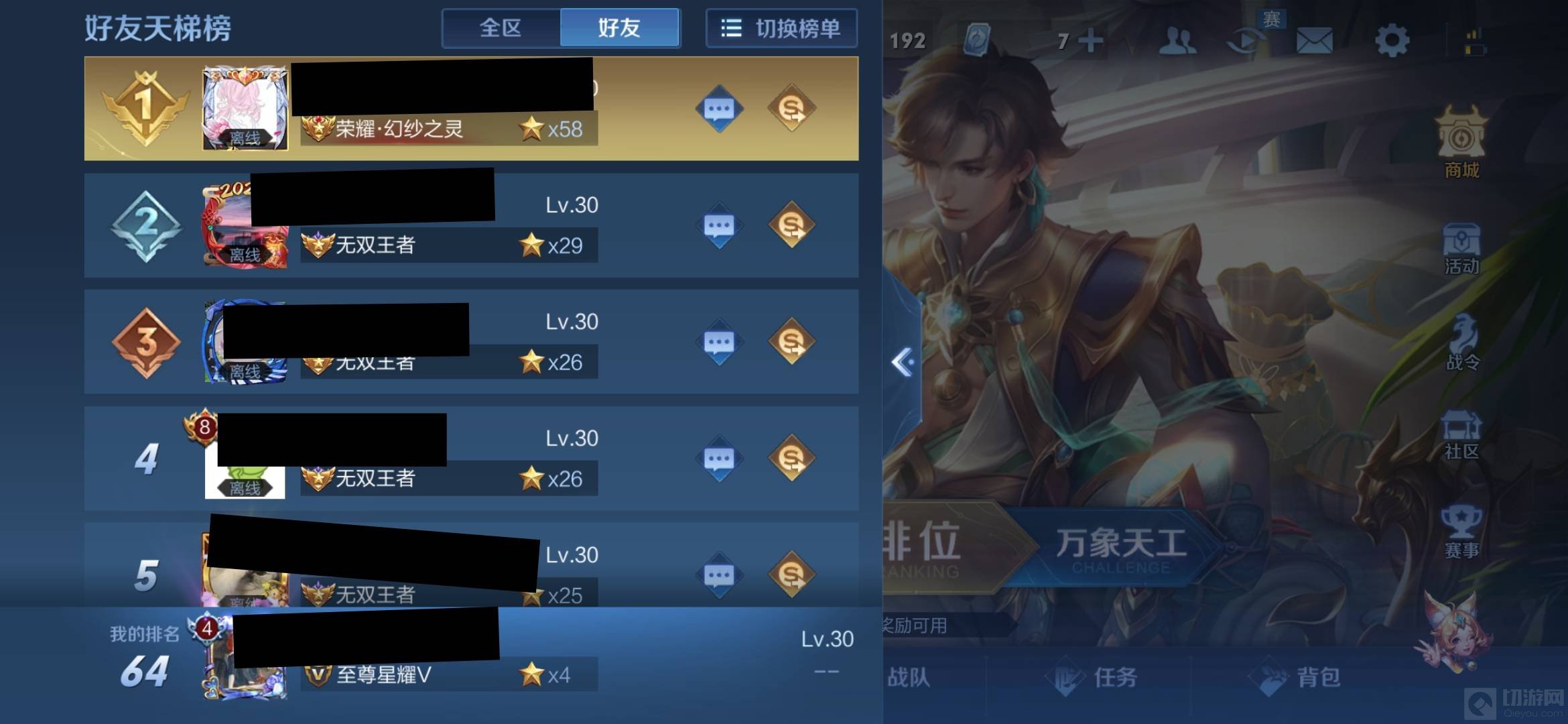 4、在天梯榜内会显示全区的排名榜和好友的排名榜。