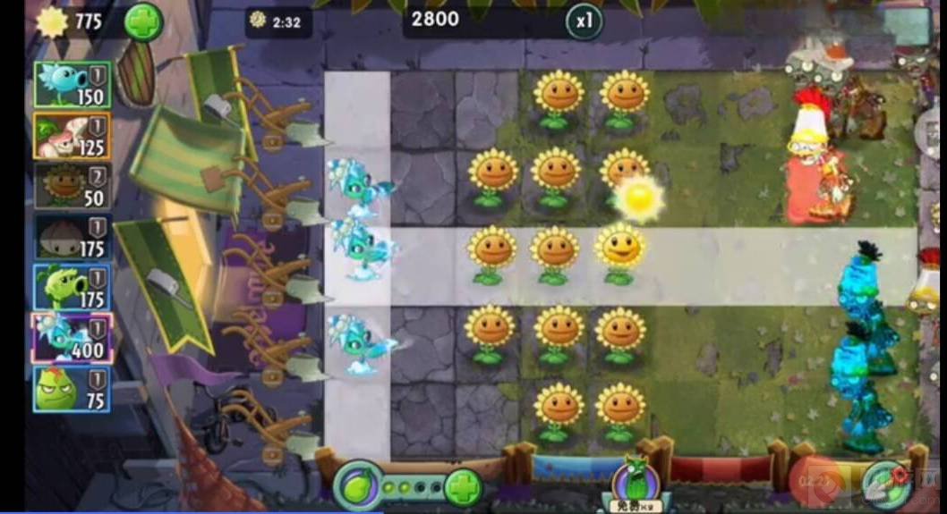 2,然后可以先种一些向日葵产生阳光还有槲寄冰仙子和豌豆手来打僵尸。在最后几十秒的时候可以把一些向日葵换成冰仙子用来抵御大疆尸的入侵,其实主要靠仙子就可以了。