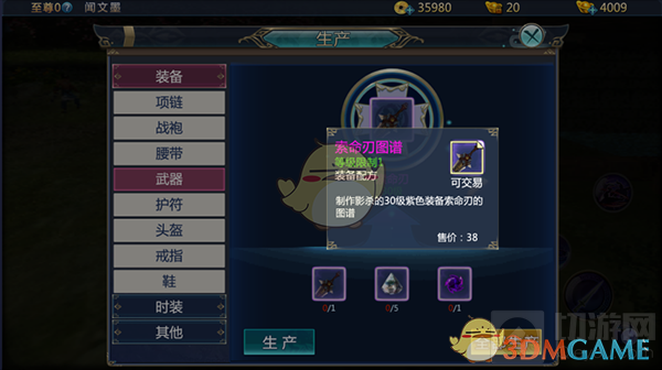 3.装备制造,制作装备当然需要制作材料,首先得有装备图纸以及各类制作材料,在刷副本或者打怪时有概率获得装备图纸,根据自身职业选择相应的图纸制作装备,图纸分为绿色、蓝色、紫色、金色四类,金色最好。图纸最简单的获取途径为商城出售,这里至少都可以获得紫色品质的图纸。