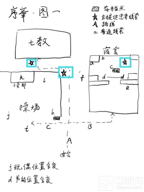 5、往左边的操场走可以先看到一个存档点和一个公告栏,没啥内容,但是闲的无聊可以看看。再往左有俩男同学在聊天,上前对话可以获得普通线索一条。左边长椅旁有一个玩偶,过去捡起会过一个意志判定并获得一个没有卵用的普通线索。玩偶的位置也会变动。