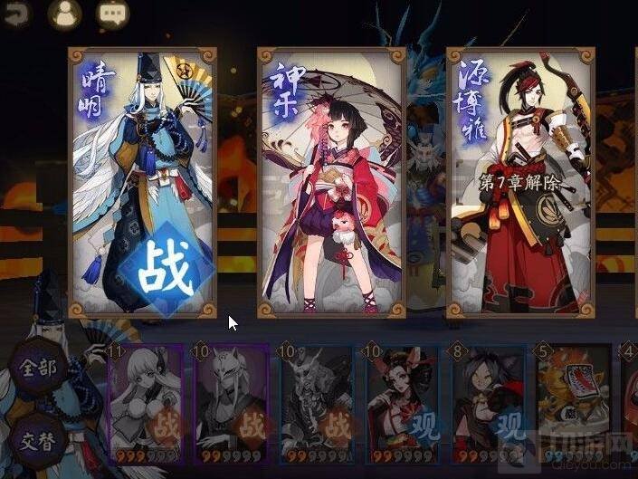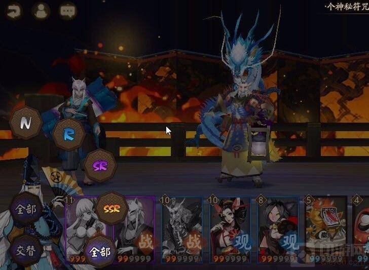 2.点击全部按钮,可以按照式神等级分类来进行分类的选择,更换的方式是点选卡牌按住不放,然后拖动到需要替换的式神模型上完成交换。