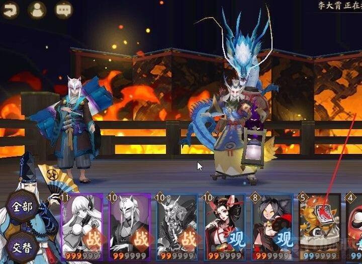 1.战斗界面中的准备阶段可以观察到出战区和观战区两个部分,蓝色是出战区,点击后可以更换出战的式神,正在出战的式神是人物模型,备选是卡牌。观战式神的卡牌上标示着“观”。