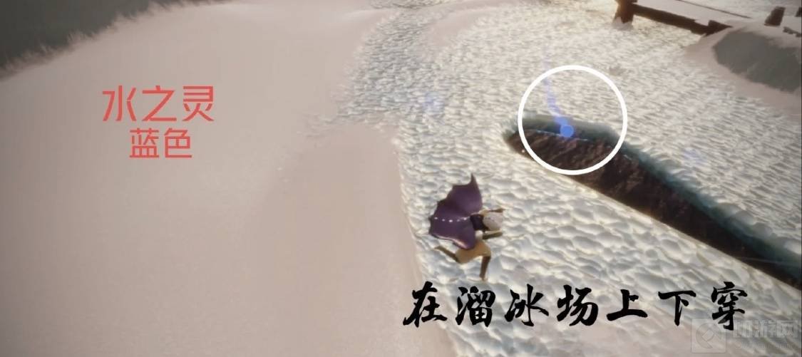 2、然后回遇境,进入霞谷地图,顺着滑道来到霞谷的溜冰场,水之灵就在溜冰场内,是蓝色的光球。