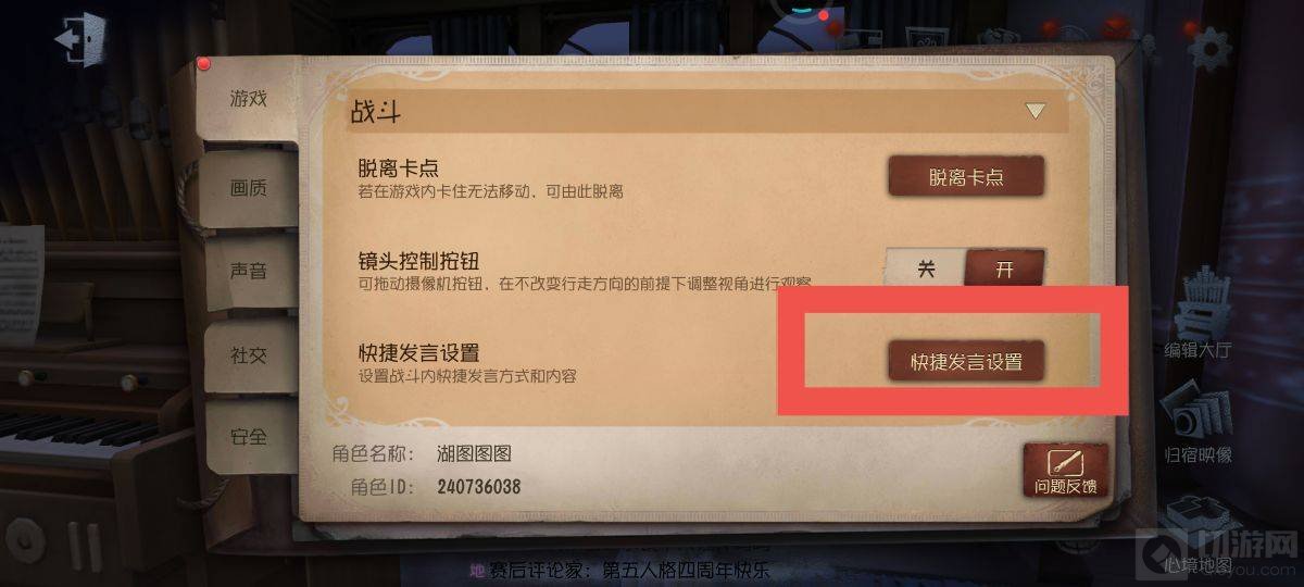 第五人格局内交流怎么改?在游戏中有部分玩家对此还不太了解。在游戏中有部分玩家的此还不太了解。 第五人格改局内交流方法 1.先打开第五人格,点击右上角设置。 2.进入之后,选择快捷发言设置。 3. 进入