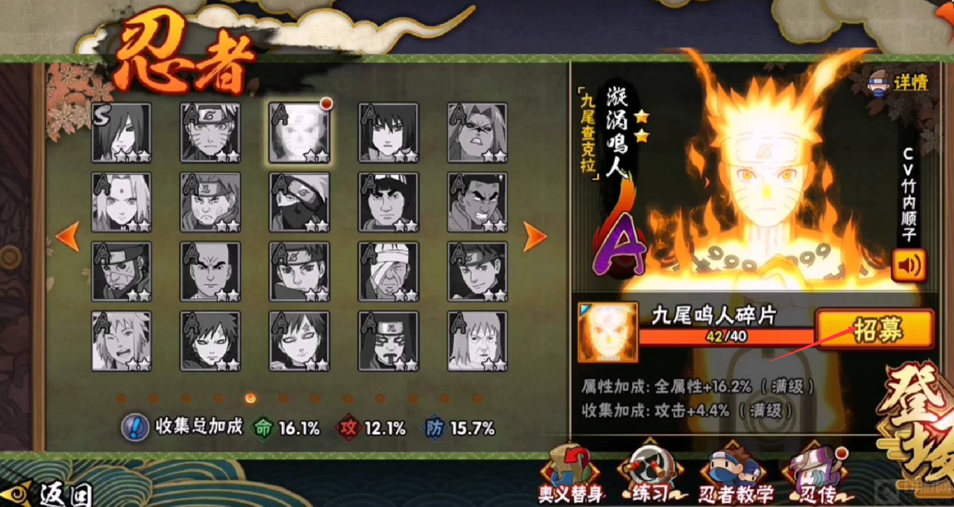 火影忍者手游金鸣怎么获得?在游戏中有部分玩家的此还不太了解。接下来让为大家介绍一下吧。 火影忍者手游金鸣获得方法 1.在火影忍者游戏的高级招募中,可以抽到金鸣碎片,建议玩家10连招募,必送S级忍者碎片