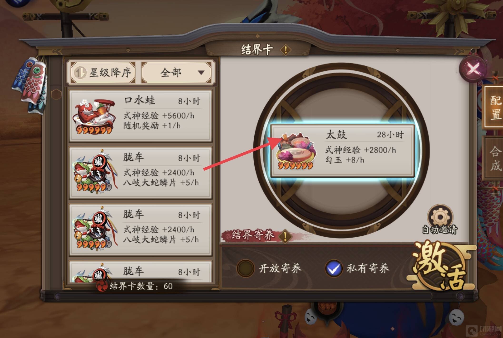 阴阳师结界卡太鼓可以通过合成获得(比较难),有时候也可以在神秘商人购买获得,也可以在爬塔活动中兑换获得,放置在结界中可以让式神获得经验,玩家获得勾玉。