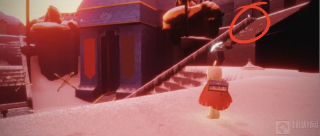 2、进入终点之后向重点台子上的右上方飞,如下图,被红色圈起来的地方就是鞠躬先祖的位置。