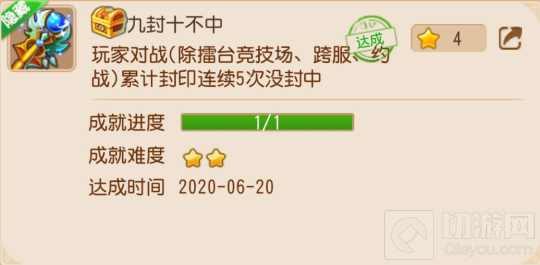 成就内容:玩家对战(除擂台竞技场、跨服、约战)累计封印连续5次没封中