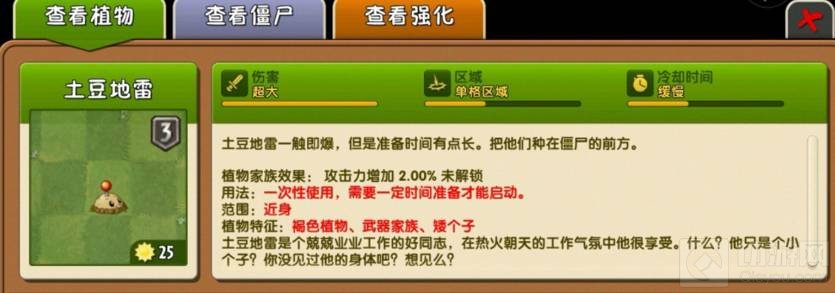 3、使用土豆地雷:可以与僵尸同归于尽。