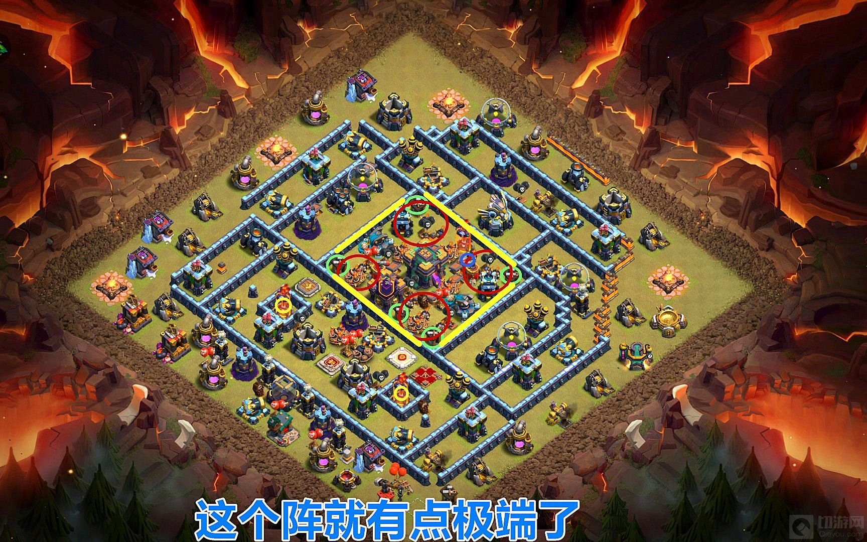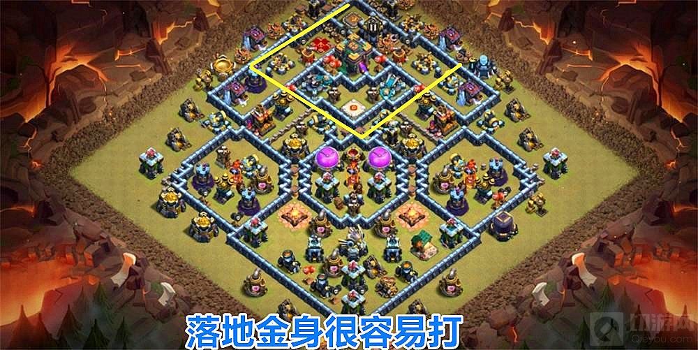 1.这个阵型做得比较极端,大本营、部落城堡、投石炮都在一个区域,并且离最外围很近,其实这样的阵型已经非常少见了,有兴趣的玩家可以去找一找,母鸡的雷龙进攻视频,打这种阵型真的很容易,咏王落地金身直接带走主防御阵地和大本营。